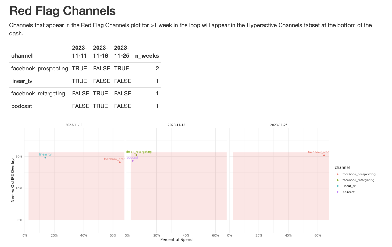 At the very end, the dashboard will show week-over-week change plots for any channels that are “hyperactive” (i.e., moving around in multiple weeks).