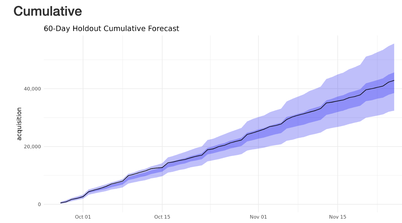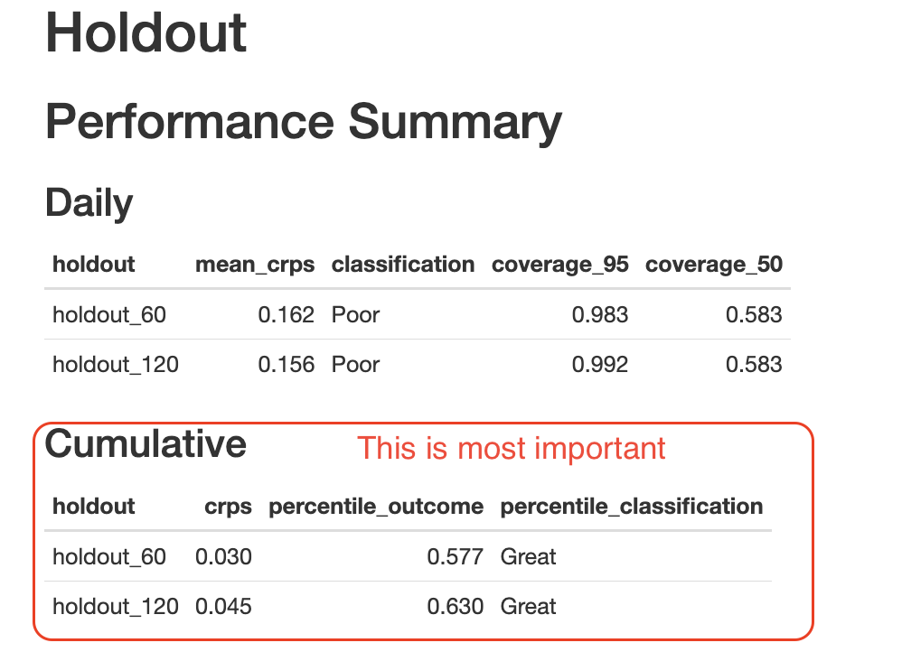 The statistics at the top quantify the quality of the holdouts. A cumulative result in the 25th-75th percentile of the forecast is considered great, while a result within the 2.5-97.5 percentile is considered good.