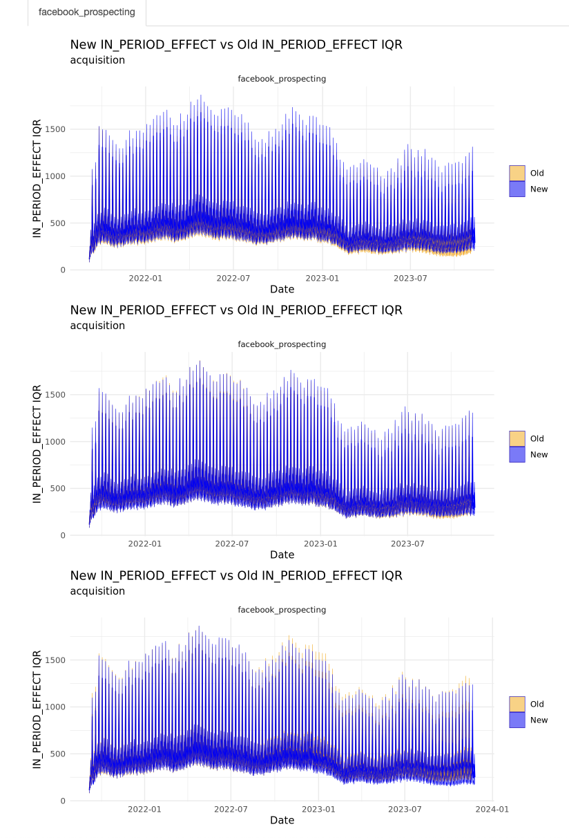 Here we can see that there are a few channels that had less than 85% in-period-effect overlap across a few different runs. Facebook prospecting is the only channel here that’s really potentially concerning since it makes up a large proportion of total spend (over 60%) and shows estimates that are moving around across multiple weeks in the loop.
