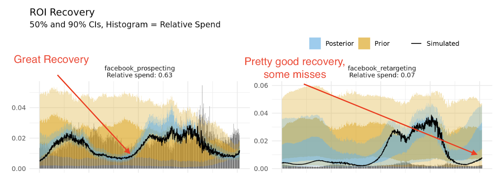 Of course, we will expect that the model will be best able to recover the ROI parameters for the channels that have the most spend and the most variation in spend so we expect that the parameter recovery will get worse as we look at progressively smaller channels.