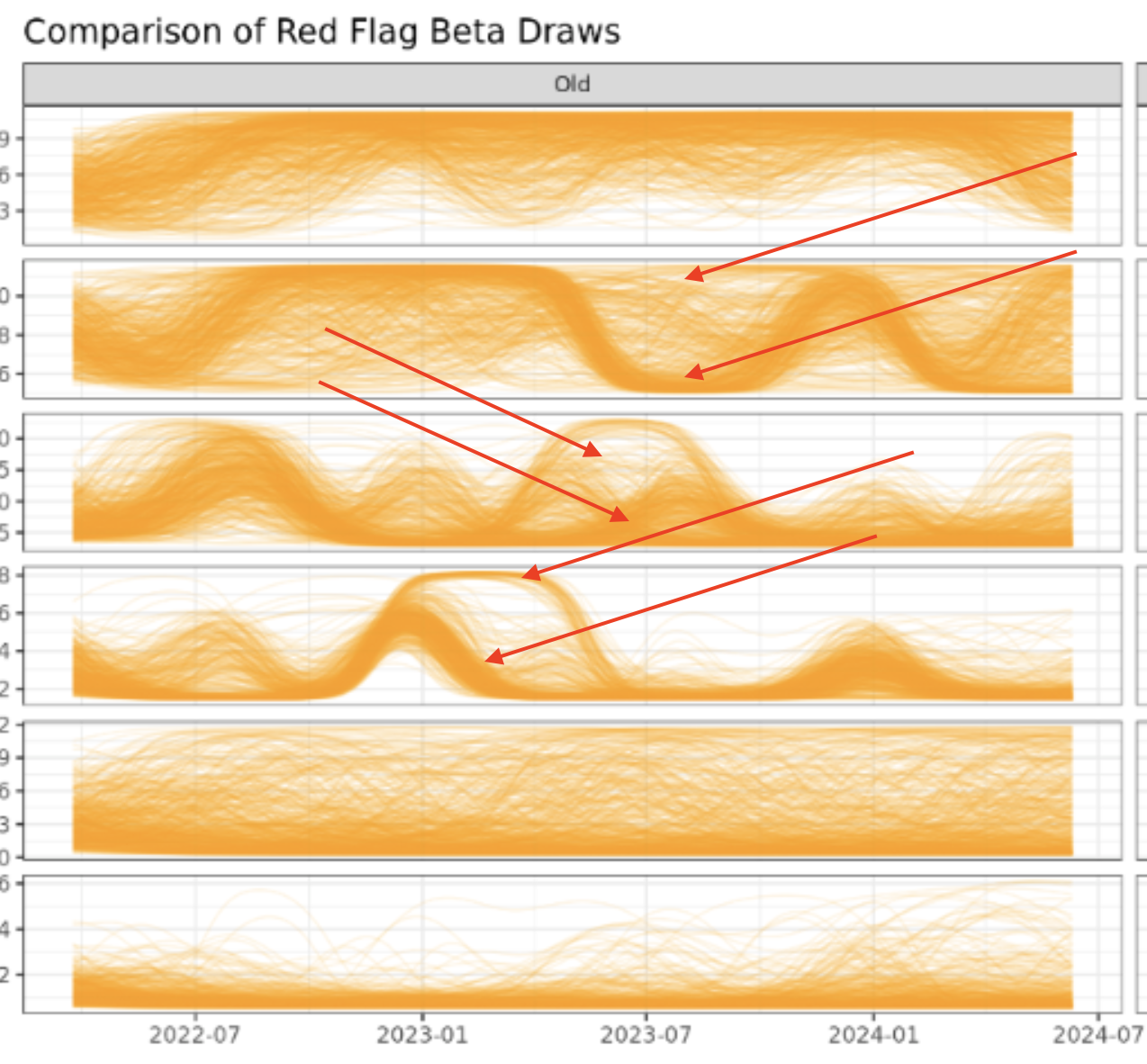 In the run analysis dashboard there are spaghetti plots for “red flag” channels that show all of the draws for the two different runs. If these plots show multi-modality where there are basically two sets of draws, one estimating high ROI and another estimating low ROI then often tighter ROI priors or different spend level settings can help to shepherd the model into only one modality.