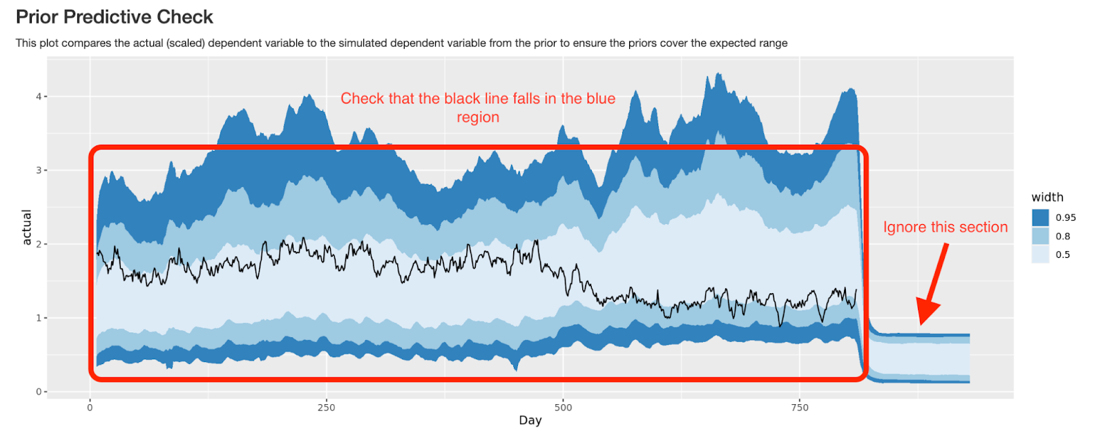 Right below the summary we show the results of a “prior predictive check”. The prior predictive check is a standard part of a bayesian model development workflow and it is best thought of as a simple “sense check” to make sure that the priors are compatible with the data in the most basic sense. Here we can see that the black line (actuals) fall well within the range of possible values that are consistent with the data (blue shaded region) so we say that this model configuration passes the prior predictive check.