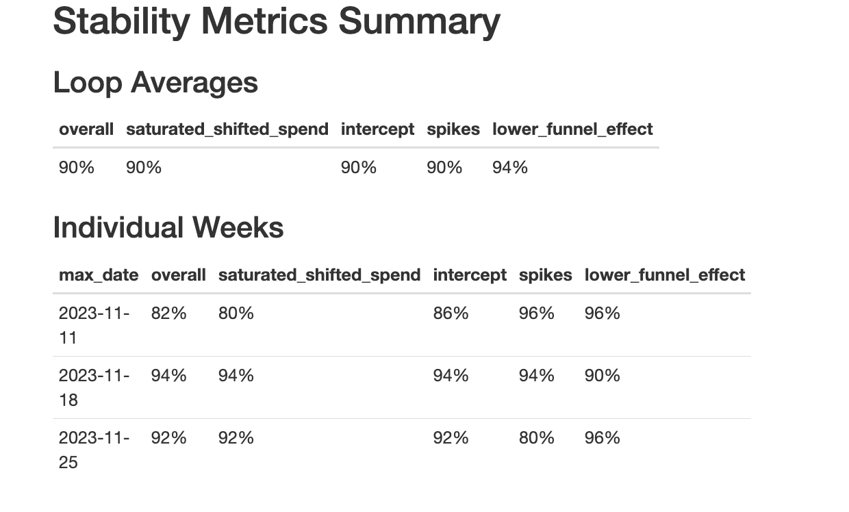 The stability percentages are broken down to show the stability for the main “families” of parameters including marketing performance (saturated_shifted_spend), the intercept, spikes, and lower funnel effects.